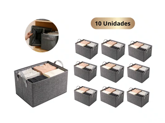 Fabricado em 100% poliéster com forro interno em nylon, o produto apresenta excelente resistência ao uso contínuo, mantendo seu formato graças às hastes metálicas internas que proporcionam firmeza e estabilidade. Seu acabamento moderno e minimalista na cor cinza combina facilmente com closets, armários, quartos e demais ambientes da casa.