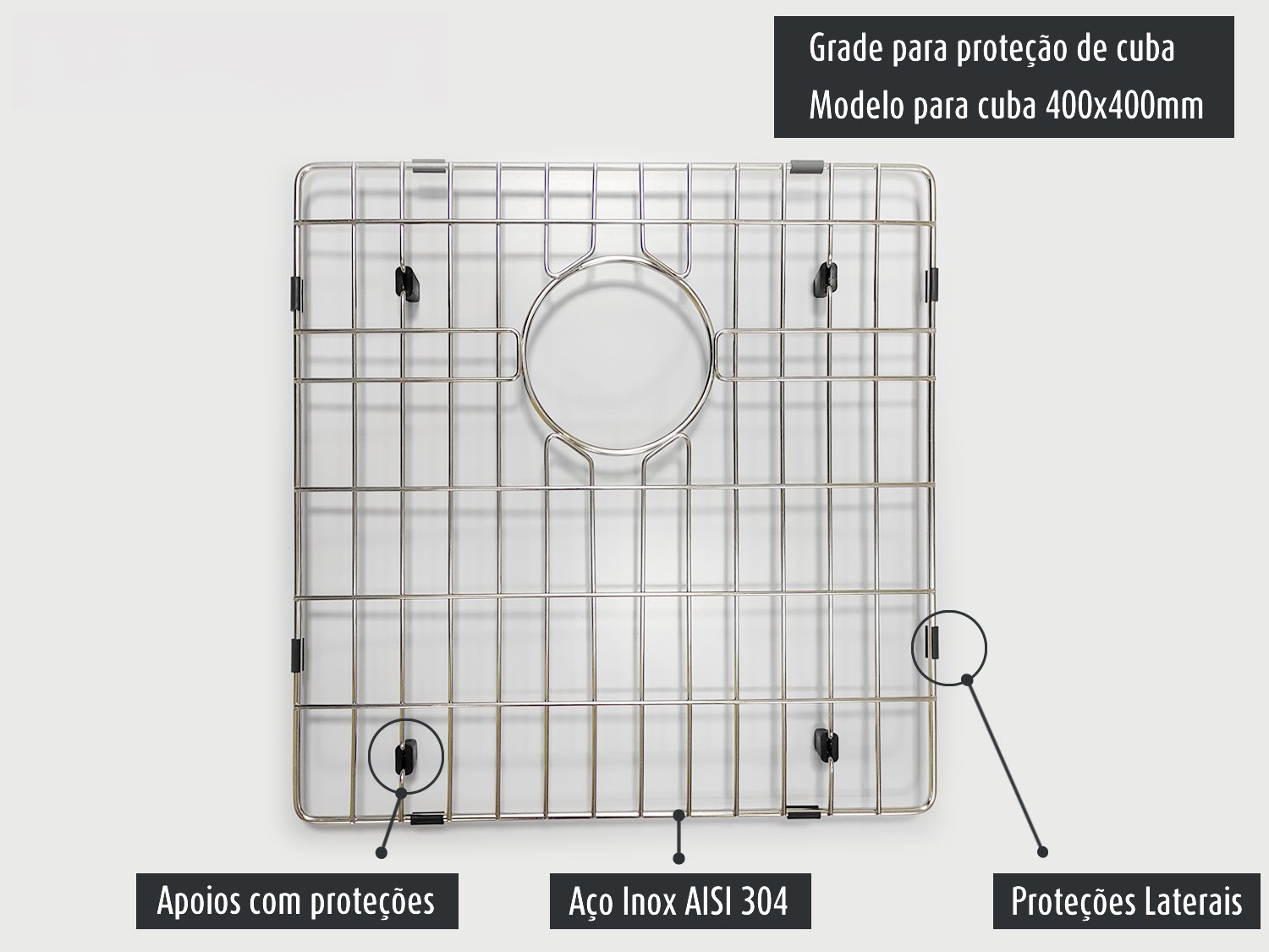 Pensando sempre no melhor uso dos produtos Calha Úmida, essa peça foi projetada para ser usada de diversas maneiras, a grade vai proteger o interior da cuba contra riscos e arranhões (sendo usada de forma correta) e também servir de escorrer de louças. É uma peça fabricada em aço inox, durável e resistente com acabamento eletropolido.