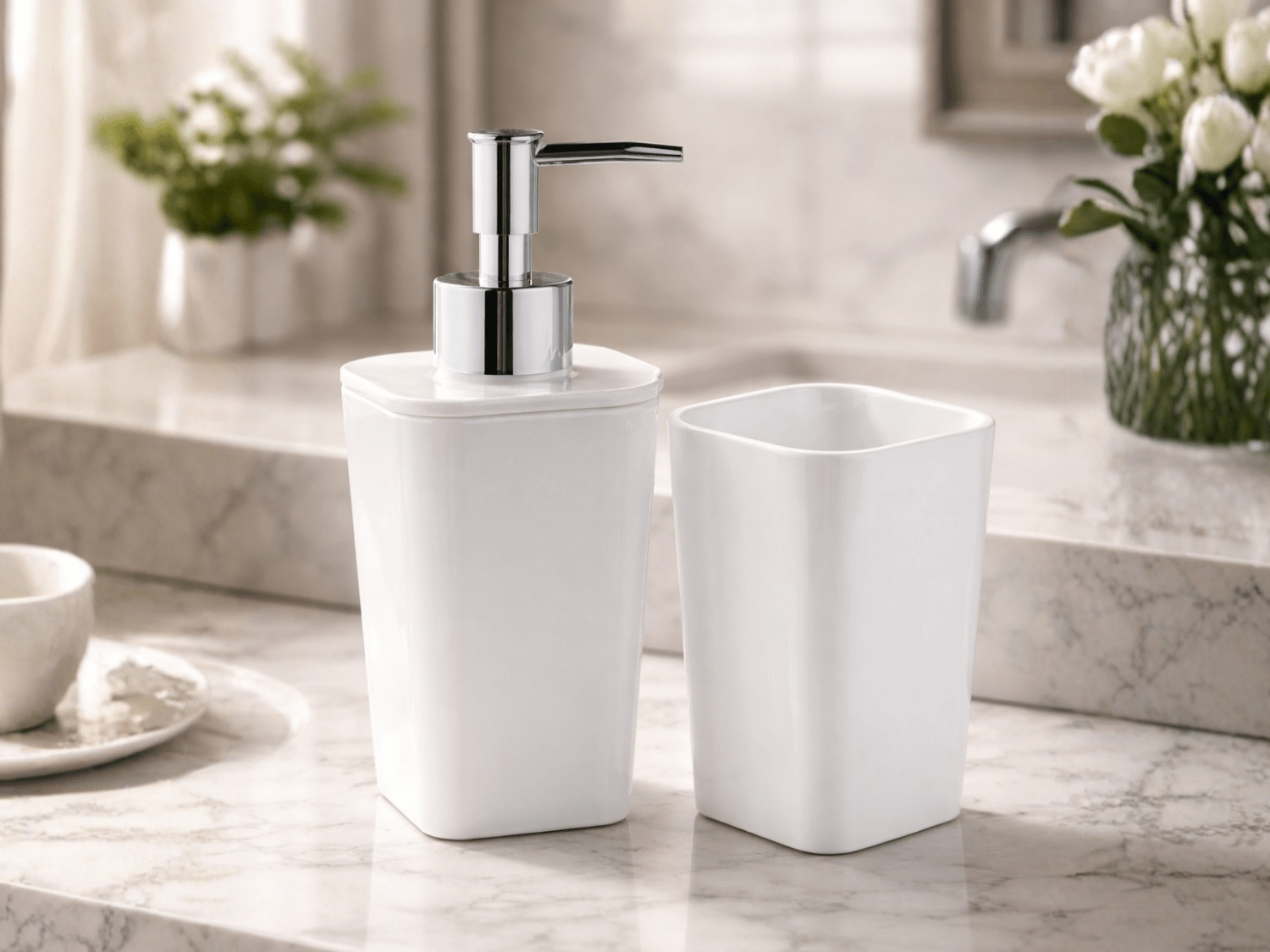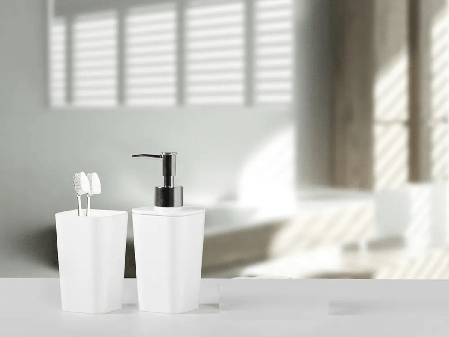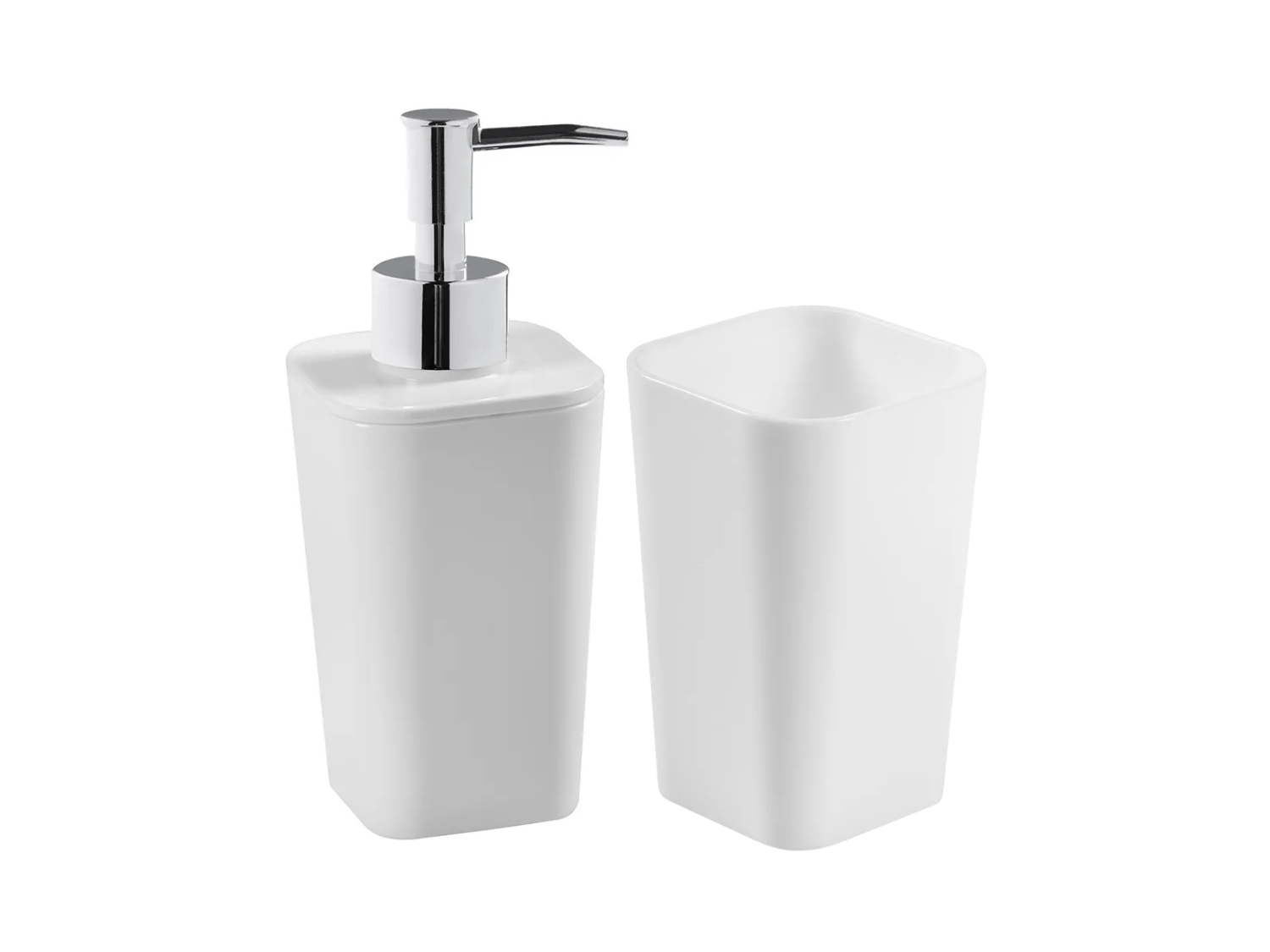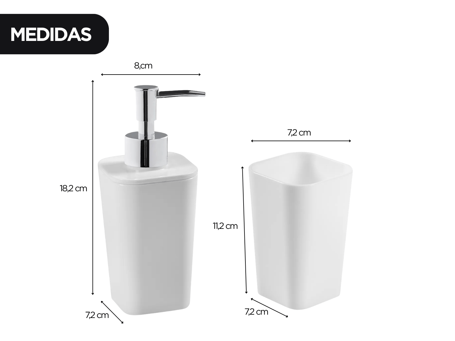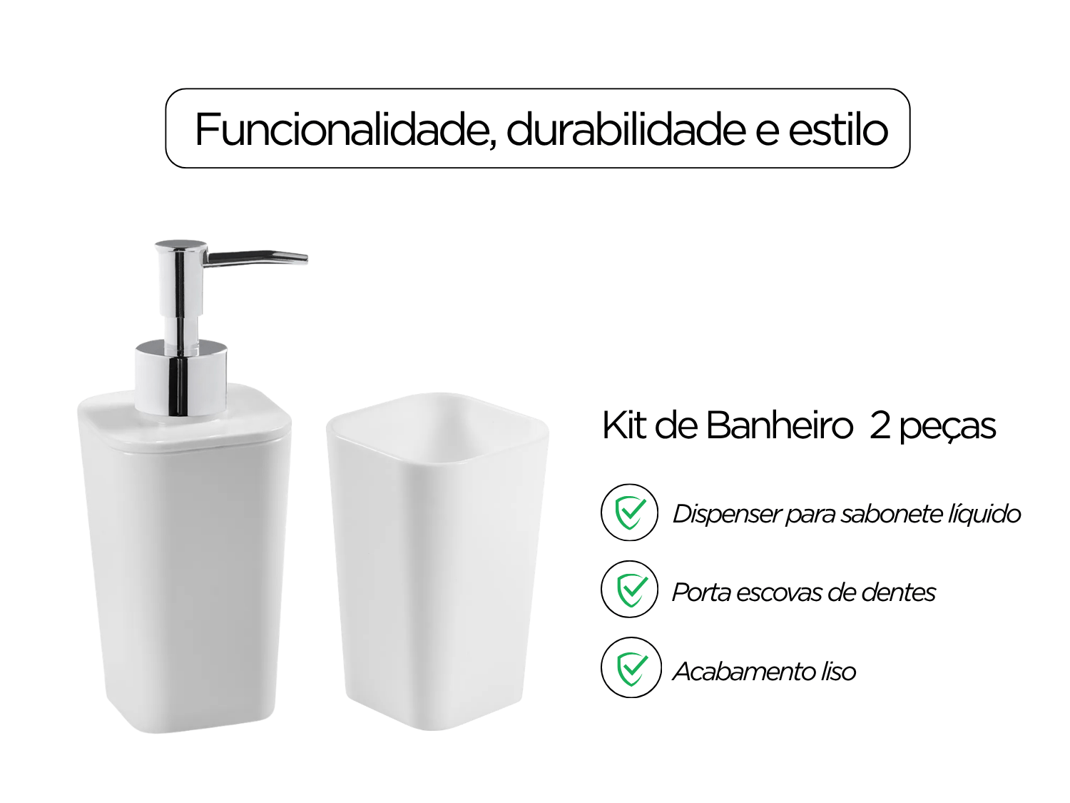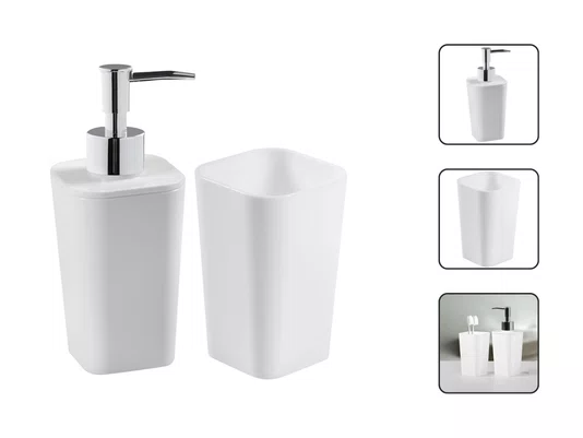 O kit é composto por dispenser para sabonete líquido e porta escova de dentes, atendendo às principais necessidades com praticidade e eficiência.