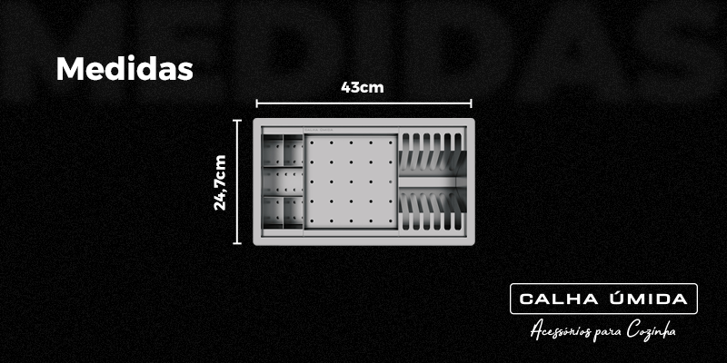 Boa tarde, como vai?! O escorredor possui 43x 24,7cm (C x L). Caso necessite de um atendimento mais imediato, oriento que entre em contato conosco via WhatsApp no número (48) 99162-8431 em horário comercial. Havendo alguma dúvida não deixe de nos perguntar, estamos aqui para melhor lhe atender. Aguardamos sua compra - Atenciosamente, Gabriela - Equipe Calha Úmida