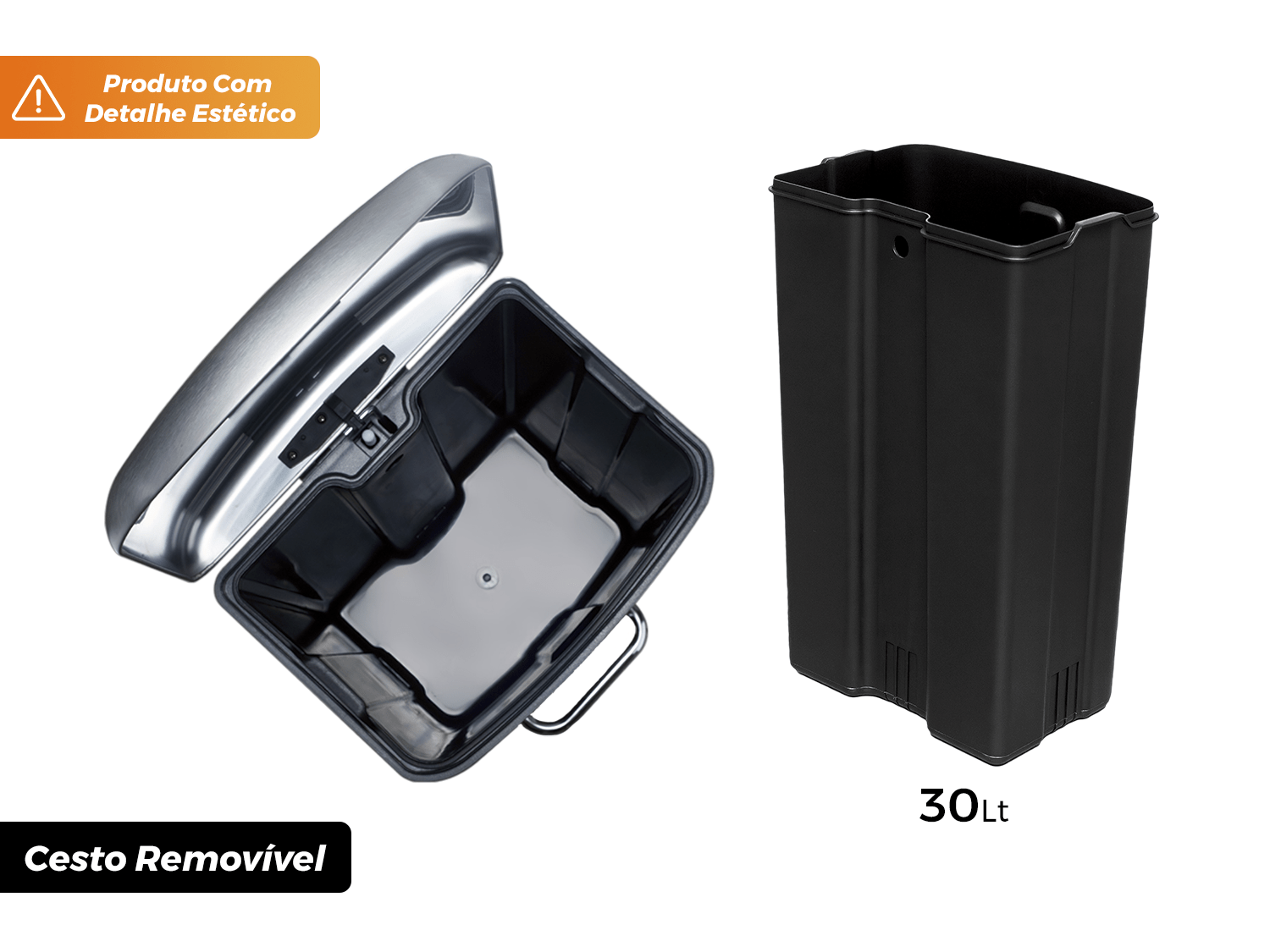 Conta com um cesto removível de 30L, totalmente vedado, facilitando seu uso e limpeza,