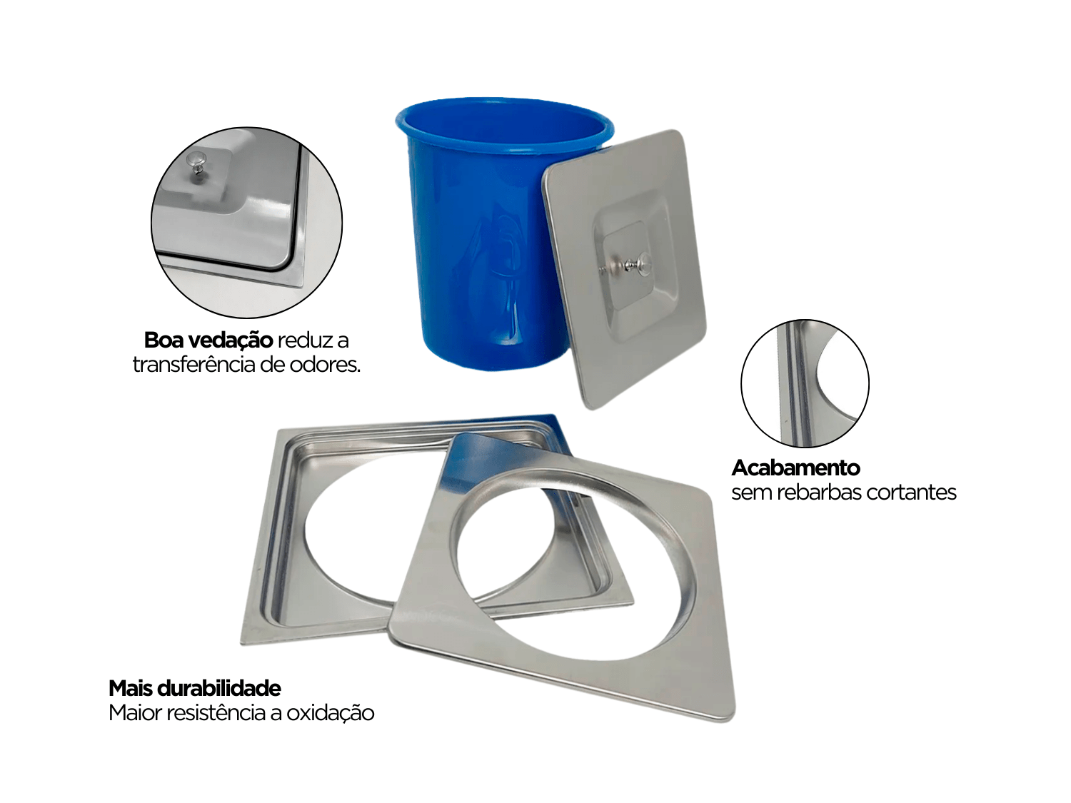 A combinação entre estrutura em inox e balde plástico removível garante maior praticidade na manutenção e higiene do produto.