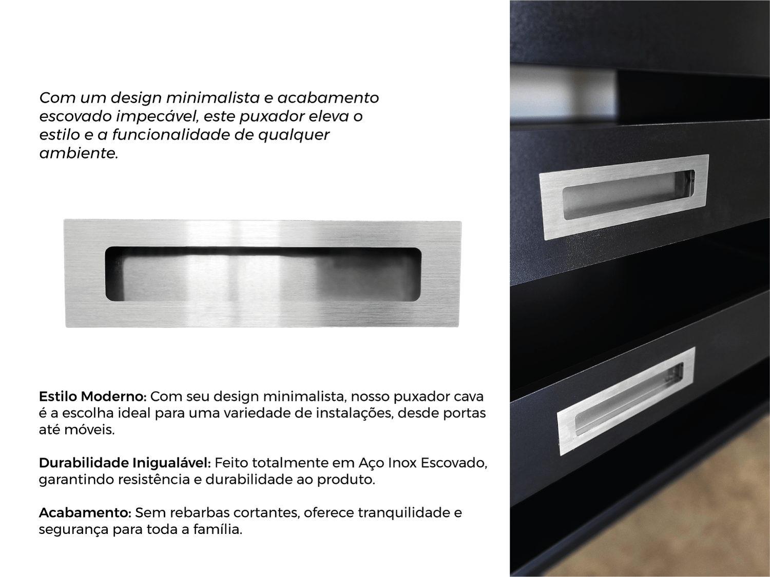 Helton M.22/09/2025Eu recomendo esse produto.Puxador Cava InoxO puxador cava concha em aço inox é uma excelente escolha para quem busca elegância minimalista, resistência e praticidade, sendo uma solução que alia design sofisticado e funcionalidade. É um detalhe pequeno que dá cara de projeto de alto padrão.Produto: Puxador Concha/Cava 30cm Em Aço Inox Escovado (2un)
