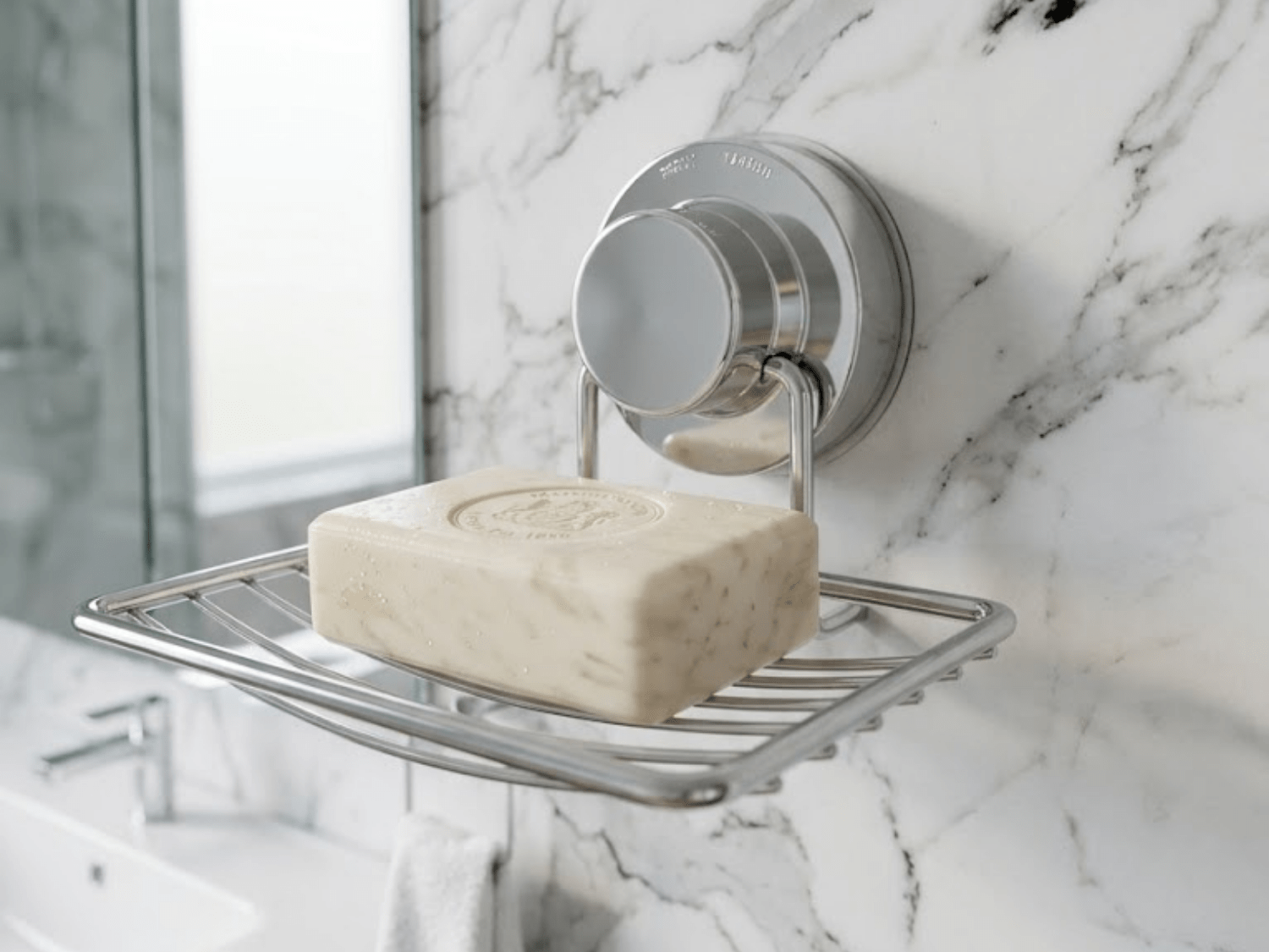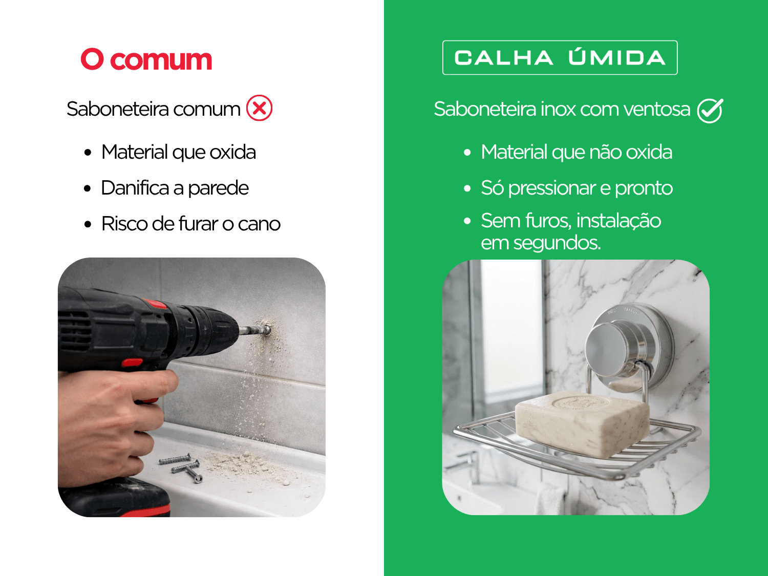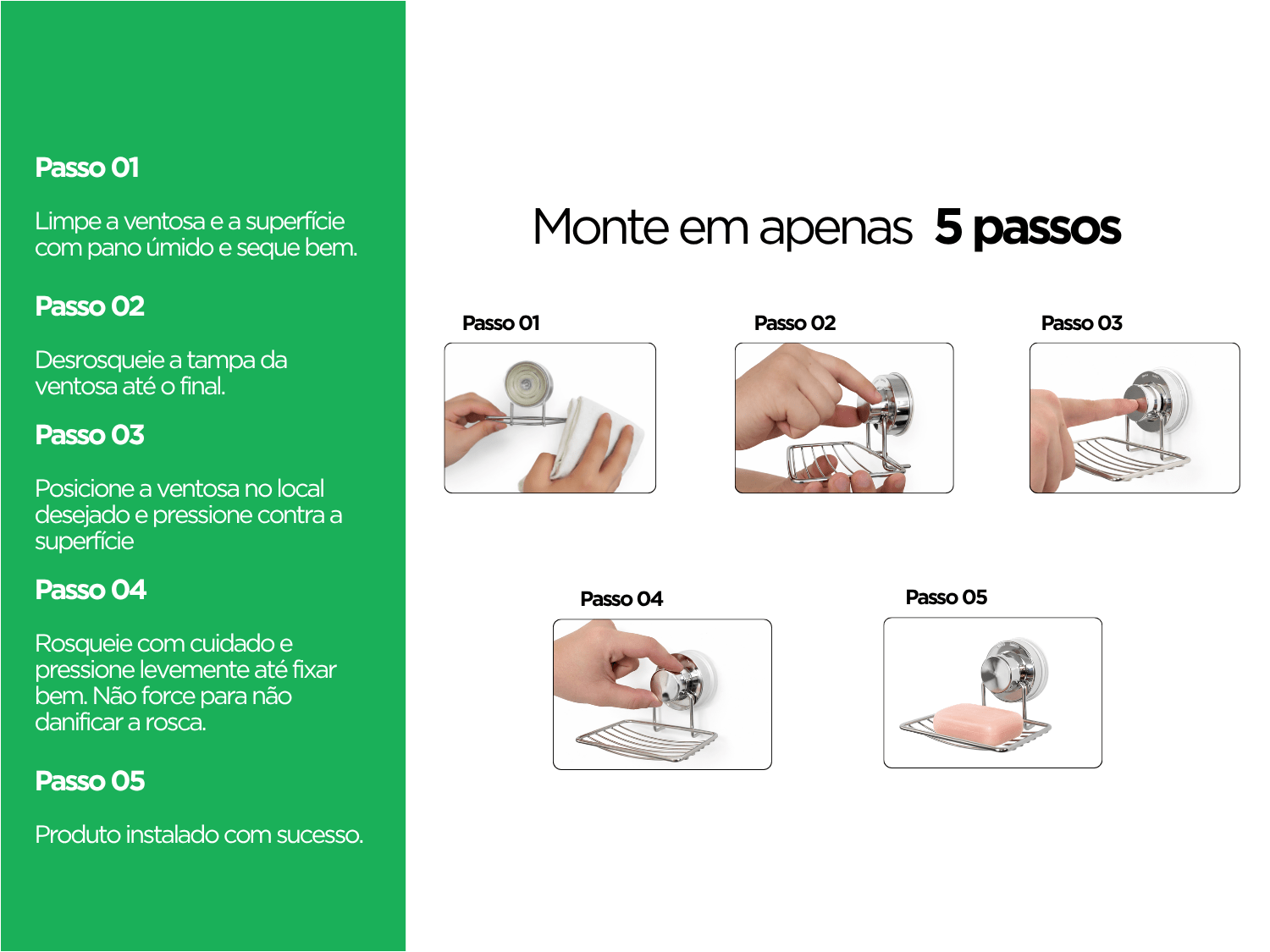 Equipada com fixação por ventosa de alta aderência, a saboneteira pode ser instalada de forma rápida, sem necessidade de ferramentas ou perfurações.