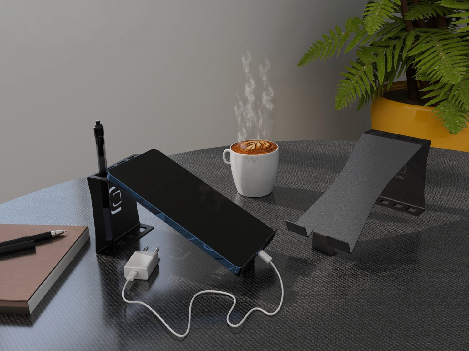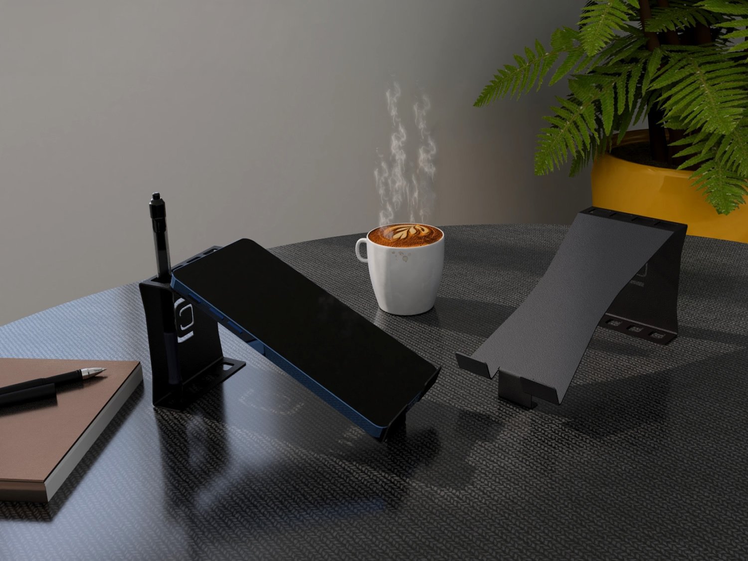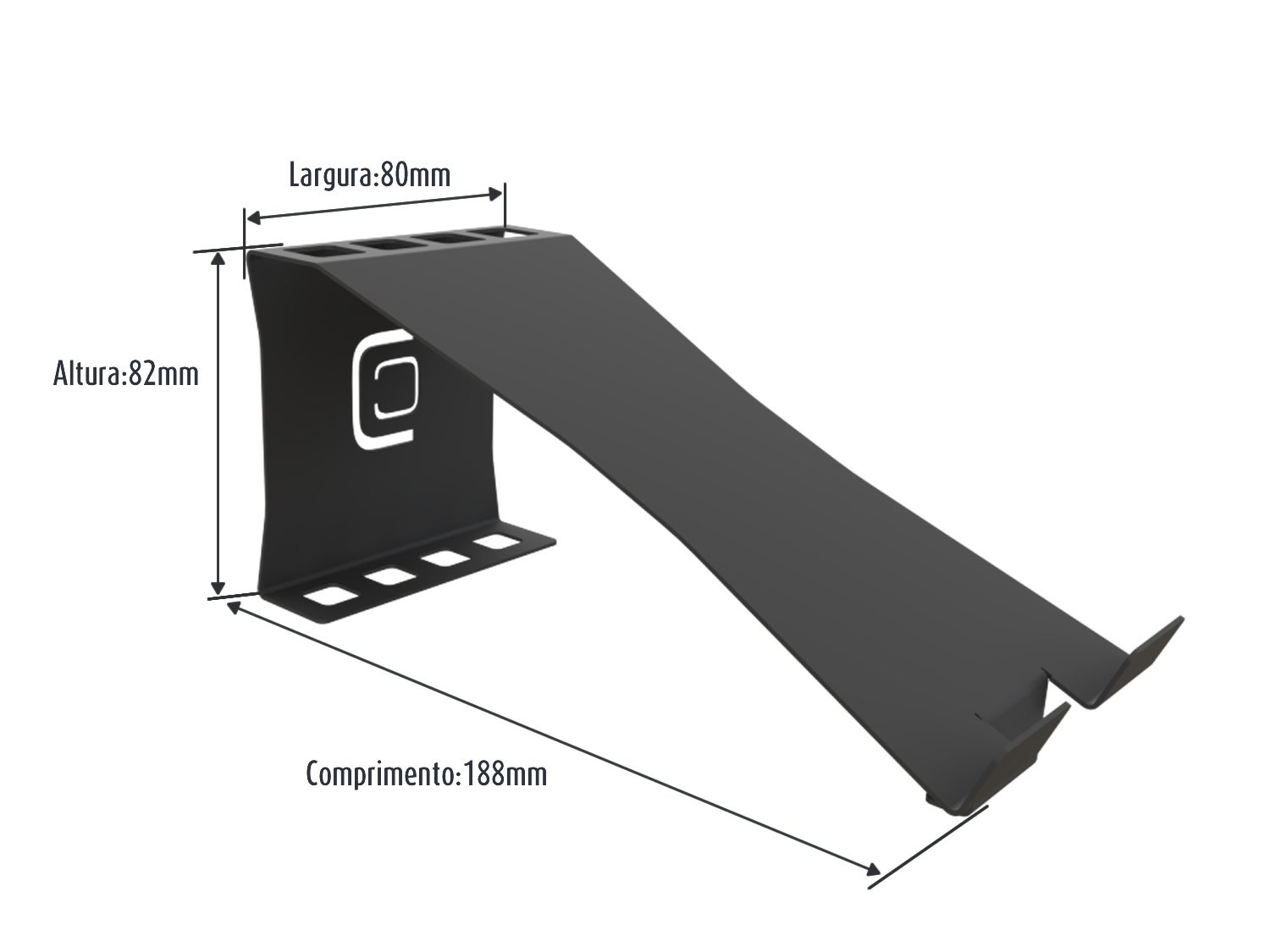 - ( Linha office da Calha Úmida ) - Material: Aço Inox - Cor: Preto Fosco - Suporta Smartphone e Tablet na horizontal.