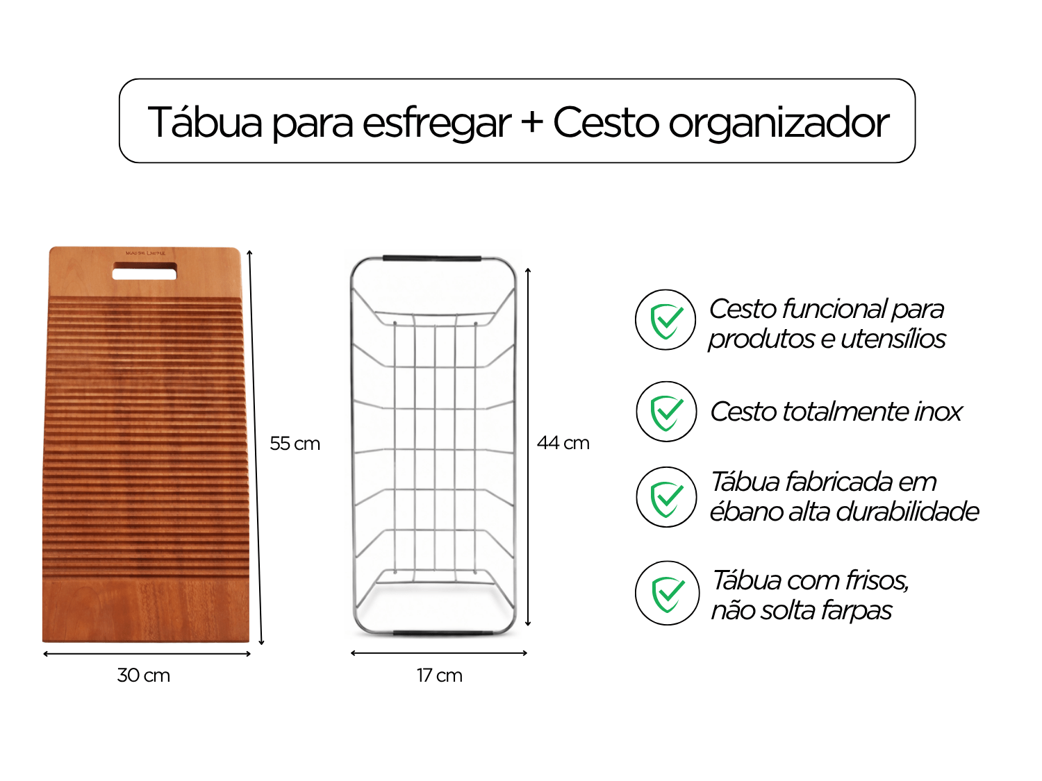 Conta também com tábua em madeira ébano com frisos, ideal para auxiliar na lavagem de roupas, oferecendo mais praticidade sem soltar farpas.