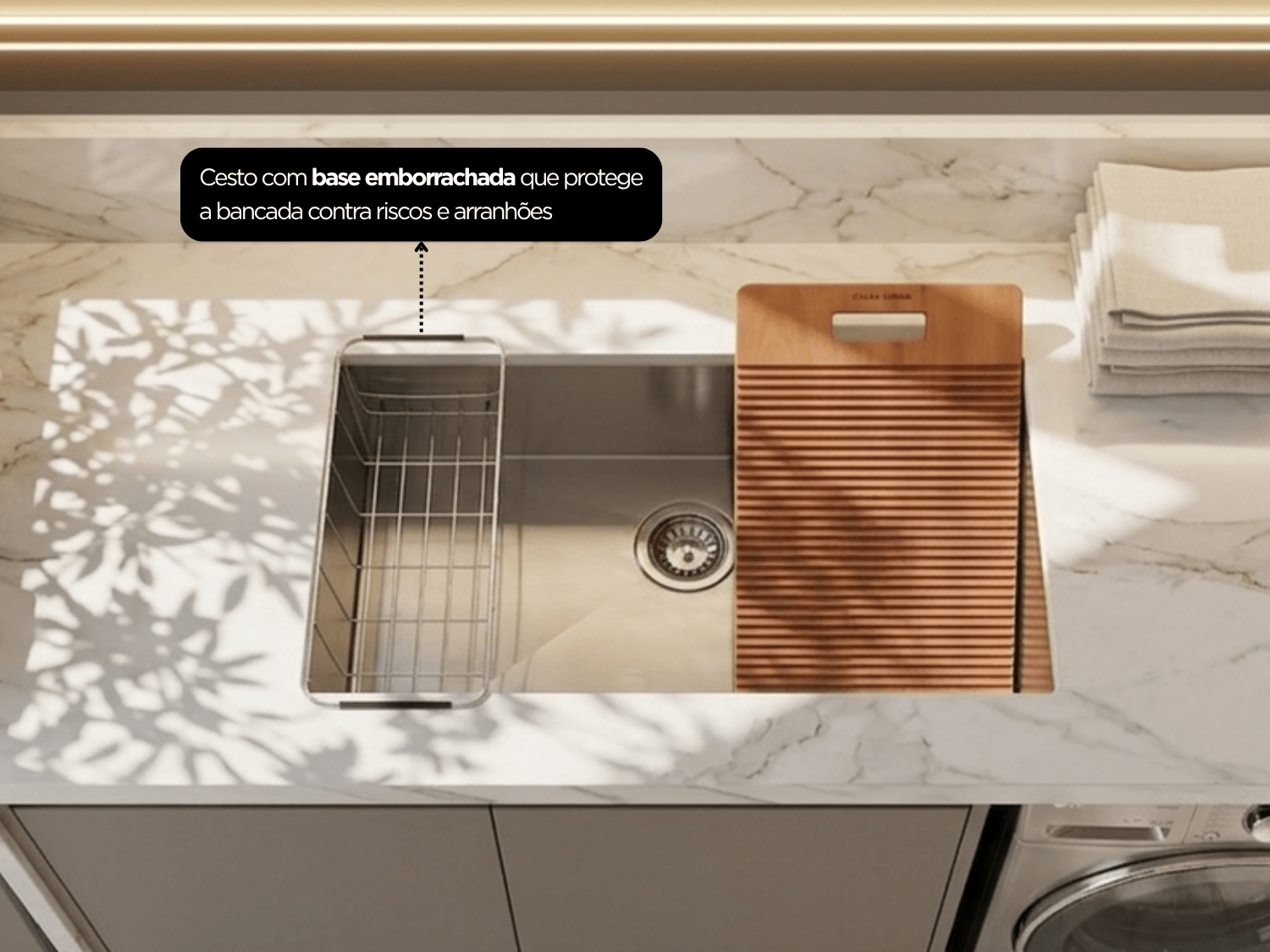 O tanque acompanha cesto em aço inox com base emborrachada, que protege a bancada contra riscos e arranhões, além de facilitar o manuseio no dia a dia.