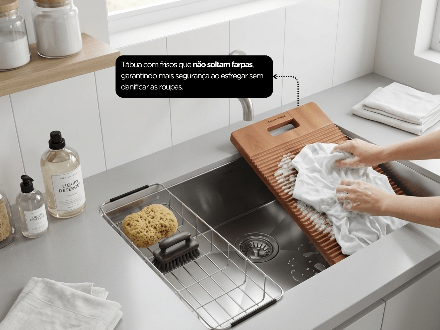 Conta também com tábua em madeira ébano com frisos, ideal para auxiliar na lavagem de roupas, oferecendo mais praticidade sem soltar farpas.