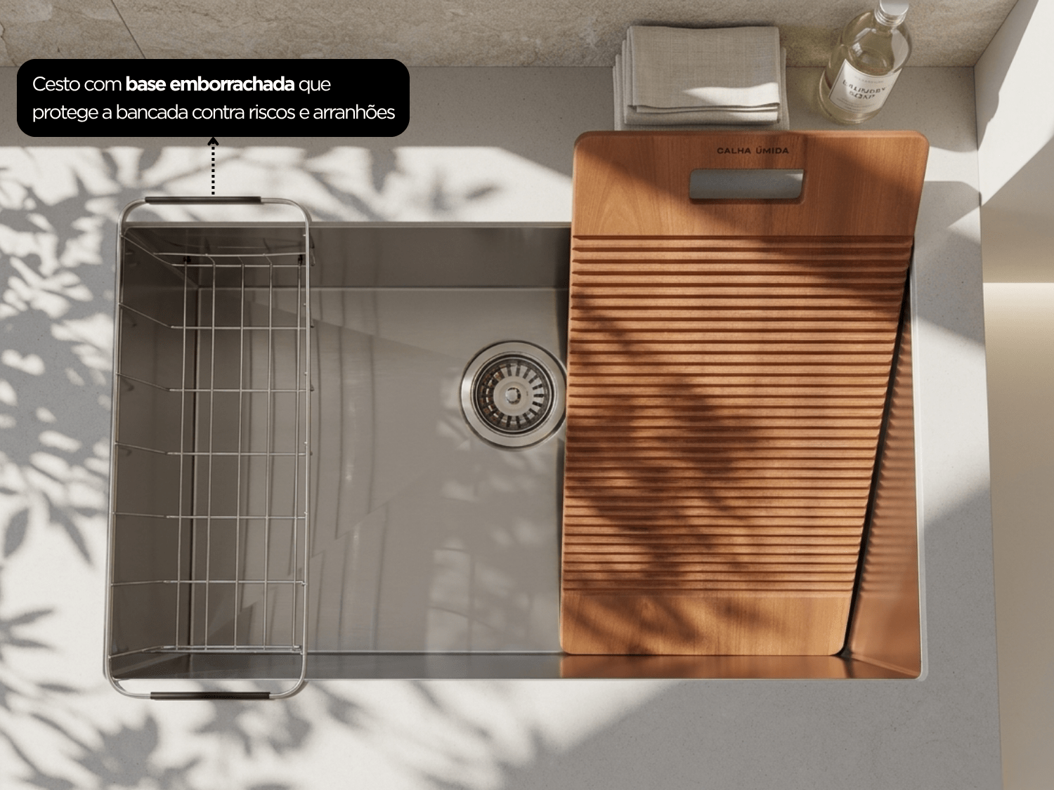 O modelo acompanha cesto em aço inox com base emborrachada, que protege a bancada contra riscos e arranhões, além de facilitar o manuseio no dia a dia.